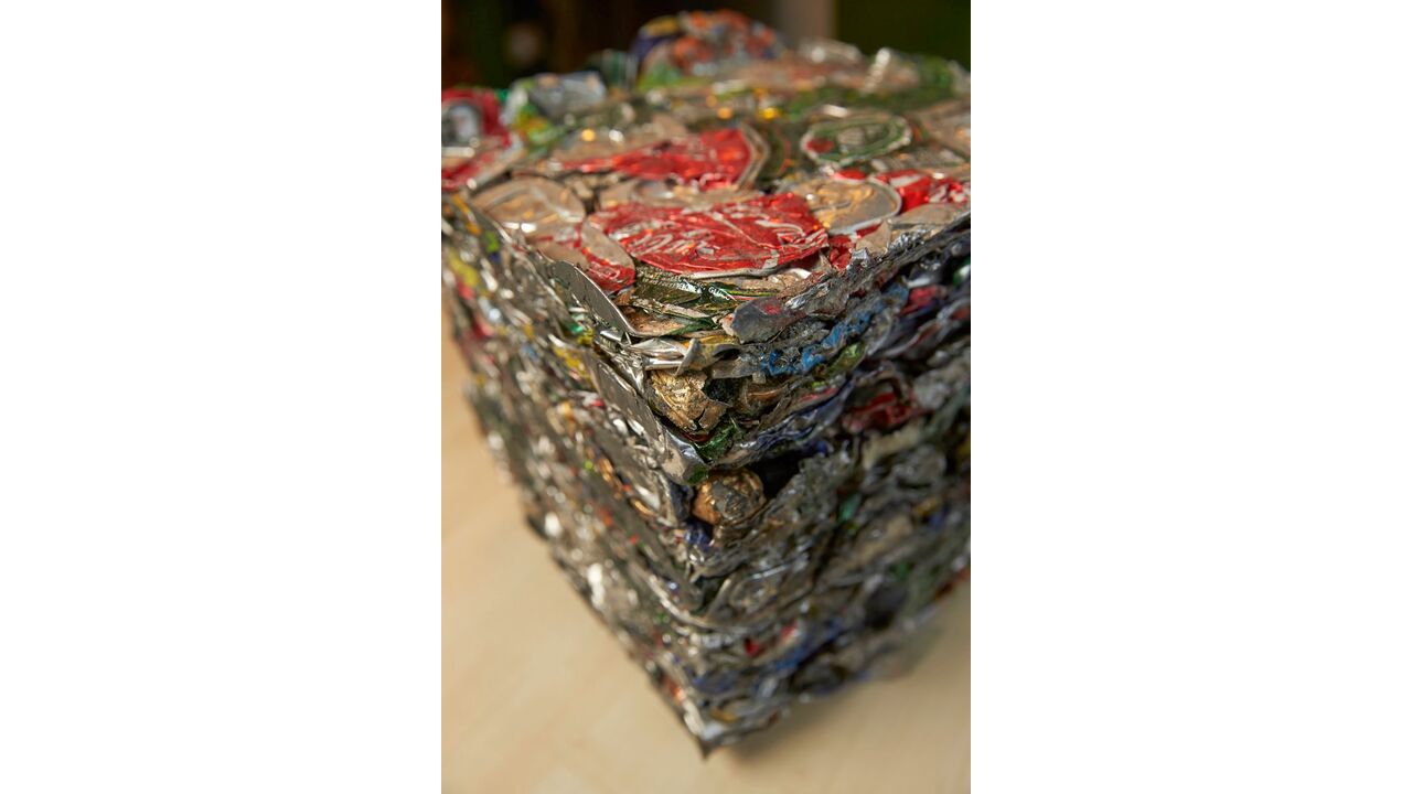 Ud kommer aluminiumsballer med en størrelse på ca. 300 x 300 x 300 mm og en vægt på ca. 16 kg. Dåsepresseren kan komprimere ca. 30 baller i timen, hvilket giver omkring 500 kg pressede aludåser i timen.